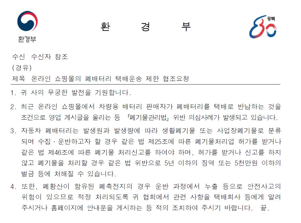 환경부로부터 온라인 쇼핑몰의 폐배터리 택배운송 제한 협조 요청을 받아 안내드립니다.