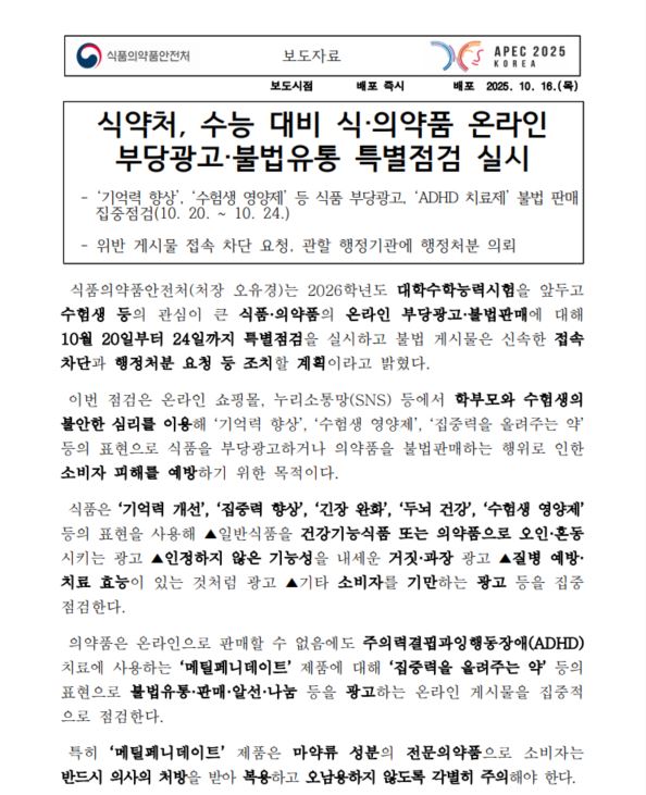식약처에서 2026학년도 수능을 앞두고 `기억력 향상’, ‘수험생 영양제’ 등 식품 부당광고 단속 (10/20 ~ 10/24) 을 진행합니다.