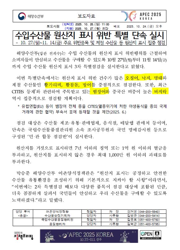 해양수산부에서 수입 수산물의 원산지 표시 위반행위 단속 (10/27 ~ 11/14) 을 진행합니다.