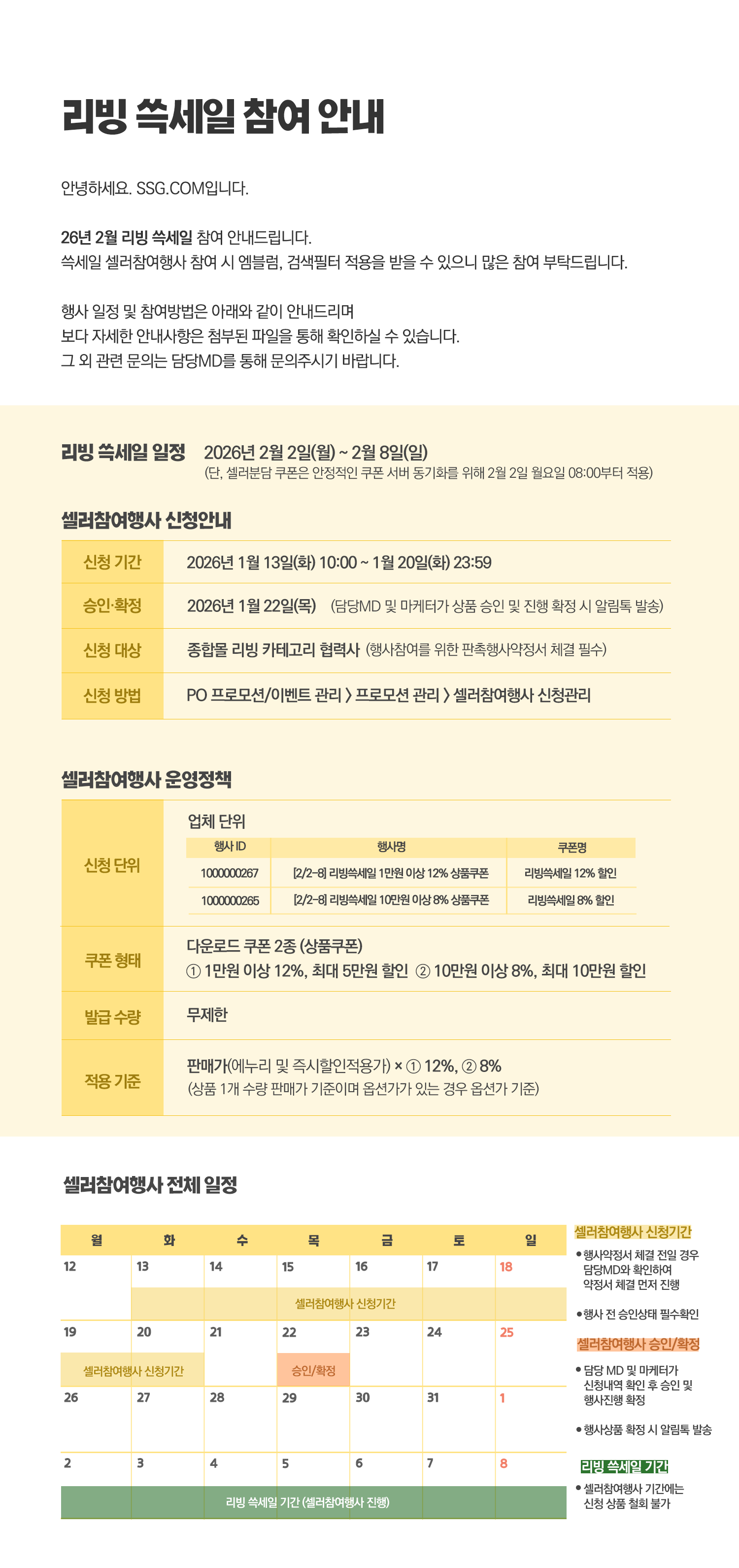 [ 이마트/SSG ] 2월 리빙 쓱세일 참여 신청 안내(1/13~1/20)