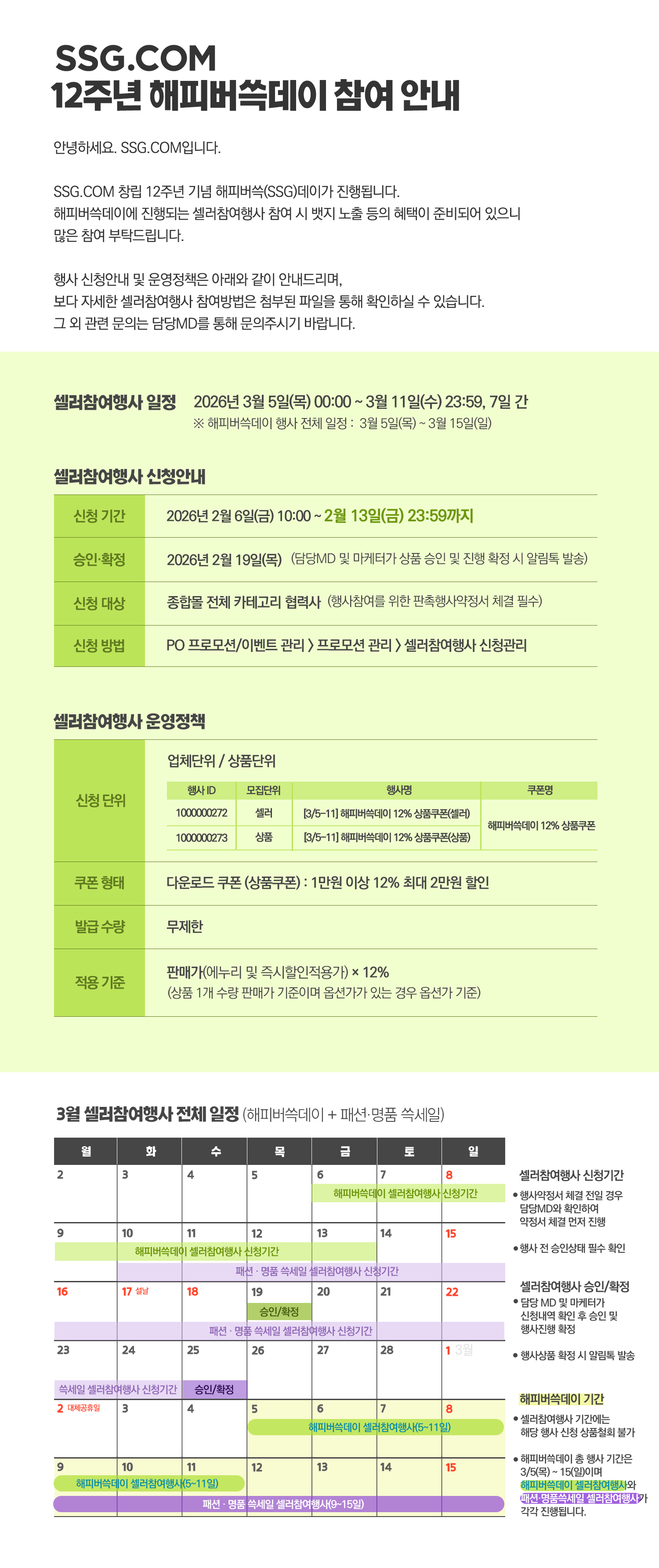[ 이마트/SSG ] 12주년 해피버쓱데이 셀러참여행사 신청 안내(2/6~2/13)