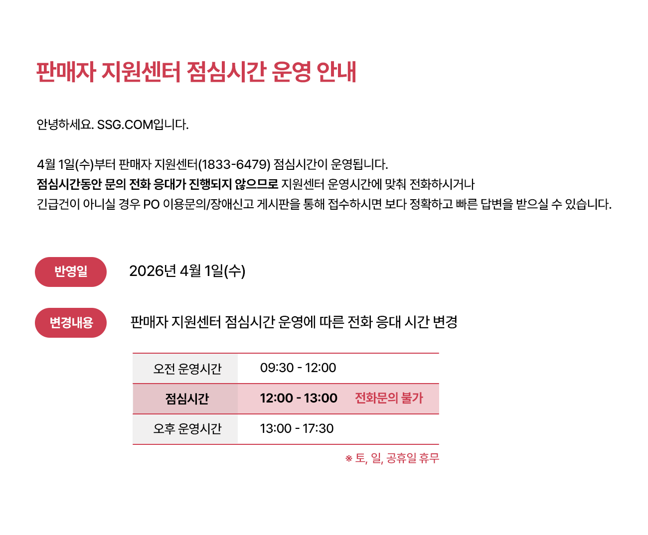 [ 이마트/SSG ] 판매자 지원센터 점심시간 운영 안내