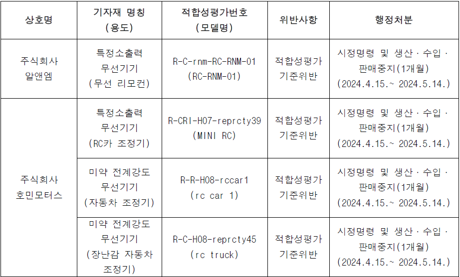 [  이마트/SSG  ] 전파법 위반업체 행정처분 안내(RC-RNM-01 무선리모컨 外 3건)