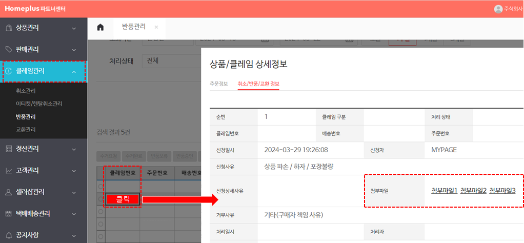 - 해당 `클레임번호` 를 클릭하면 아래와 같이 클레임 상세내용 (첨부파일 포함) 확인 가능