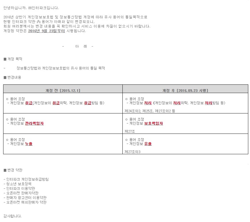 [ 바이즐(구 인터파크) ] 2016년 상반기 개인정보보호법 및 정보통신망법 개정에 따른 인터파크 약관개정