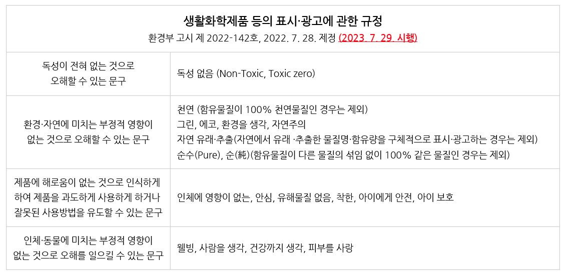 이미 2019년 1월 부터 [화학제품안전법] 제 34조에 따라 "무독성", "환경친화적, "무해한" "인체/동물친화적" 문구 또는 이와 유사한 표현을 사용하지 않도록 규정하고 있는 점 참고부탁드립니다.