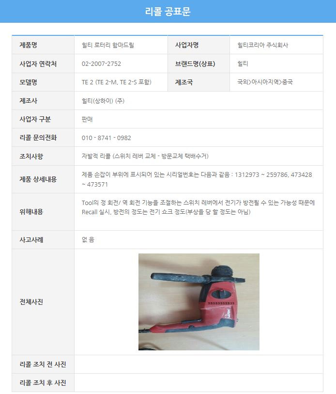 ㈜힐티코리아에서는 자사 제품인 “힐티 로터리 함마드릴” 제품의 스위치 레버에서 전기가 방전될 수 있는 가능성 때문에 자발적 리콜을 실시한다고 발표하였습니다.
