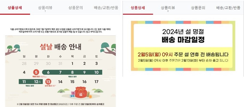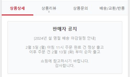 24년 설 연휴 택배사 업무 일정 (휴무일) 고려하여 고객들이 상품 구매에 혼선이 없도록 배송 공지등록을 요청드립니다.