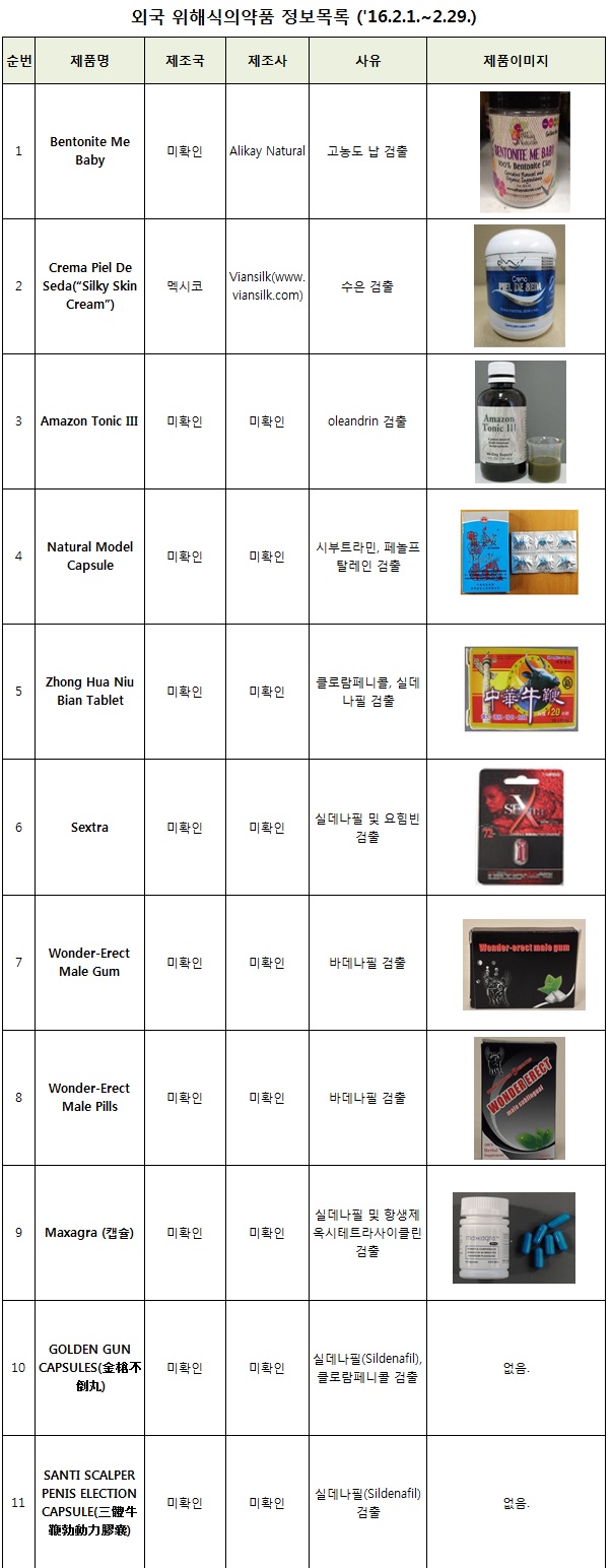 [주의] 식약처 해외 위해식의약품 정보목록 안내('16.2)