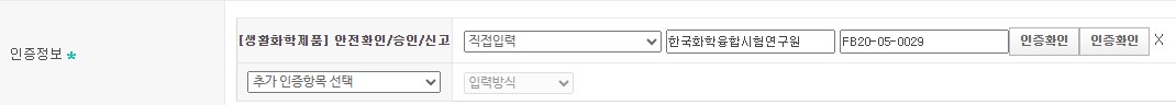 - 상품 등록/수정 > 상품고시정보 > 인증정보 > [생활화학제품] 안전확인/승인/신고 > 직접입력 > 인증기관 정보 & 인증번호 입력
