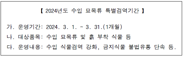 외래병행충의 유입을 방지하고 금지품의 불법 반입·유통 등을 차단하기 위하여 「수입 묘목류 특별검역기간」 을 실시할 예정으로 아래와 같이 알려 왔습니다.