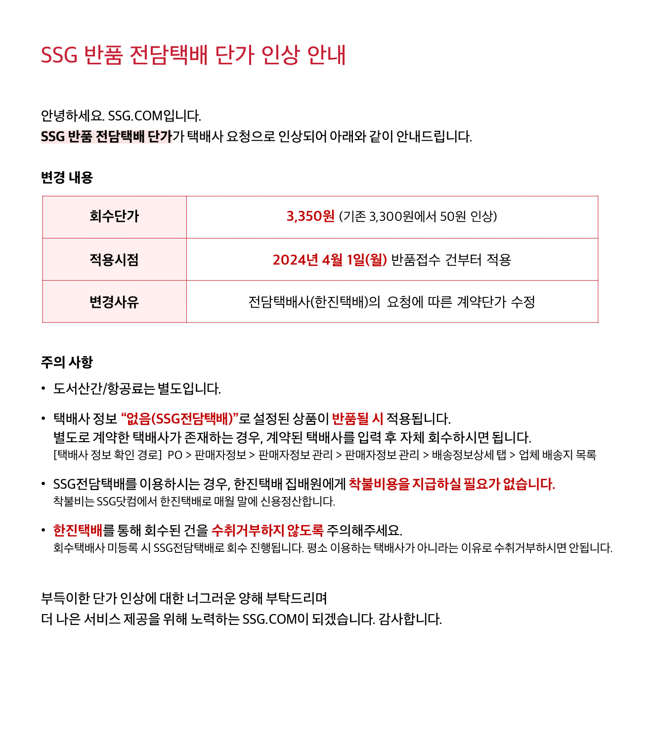 [ 이마트/SSG ] SSG 반품 전담택배 단가 인상 안내